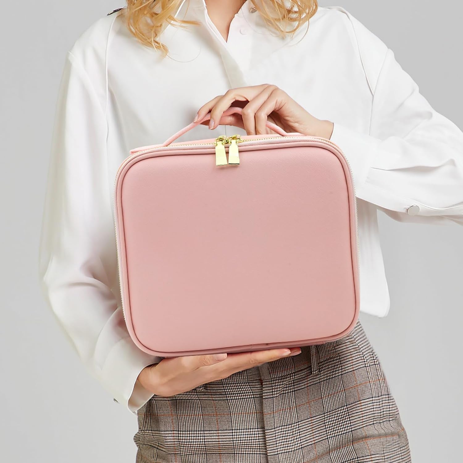 This Pink LED light makeup organizer box is the ultimate blend of utility and elegance. Crafted for makeup enthusiasts and frequent travellers, it features a large storage compartment with adjustable dividers to neatly organize cosmetics, skincare bottles, and beauty tools. The built-in rectangular touch sensor mirror with LED lighting provides optimal brightness for precision makeup, even in dim surroundings. A transparent zippered pouch under the lid keeps brushes and slim accessories safe and accessible. Its sleek design and USB rechargeable mirror make it a must-have for on-the-go beauty routines.